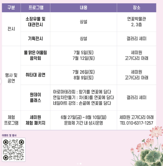 - 주요 프로그램: 연꽃 예술 한마당, 화양연화 콘서트 등 공연행사